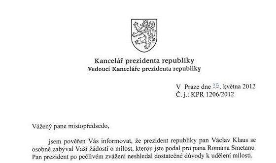 "Pan prezident po pečlivém zvážení neshledal dostatečné důvody k udělení milosti," stojí v dopisech, které odcházejí z Hradu žadatelům o prezidentský pardon pro Smetanu.