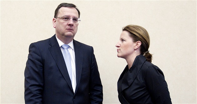Místopředsedkyně Karolína Peake hovoří s premiérem Petrem Nečasem před zahájením jednání vlády. Jedině jemu je ochotna předat případnou demisi, nikoliv stranickému předsedovi Radku Johnovi.