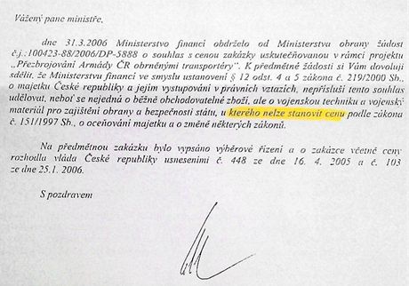 Sobotka v něm Kühnlovi na žádost o souhlas s cenou odvětil, že ministerstvu financí to nepřísluší. "Neboť se nejedná o běžně obchodovatelné zboží, ale o vojenskou techniku a vojenský materiál pro zajištění obrany a bezpečnosti státu, u kterého nelze stanovit cenu podle zákona č. 151/1997 Sb. o oceňování majetku," píše se v dokumentu, jehož kopii má iDNES.cz k dispozici.