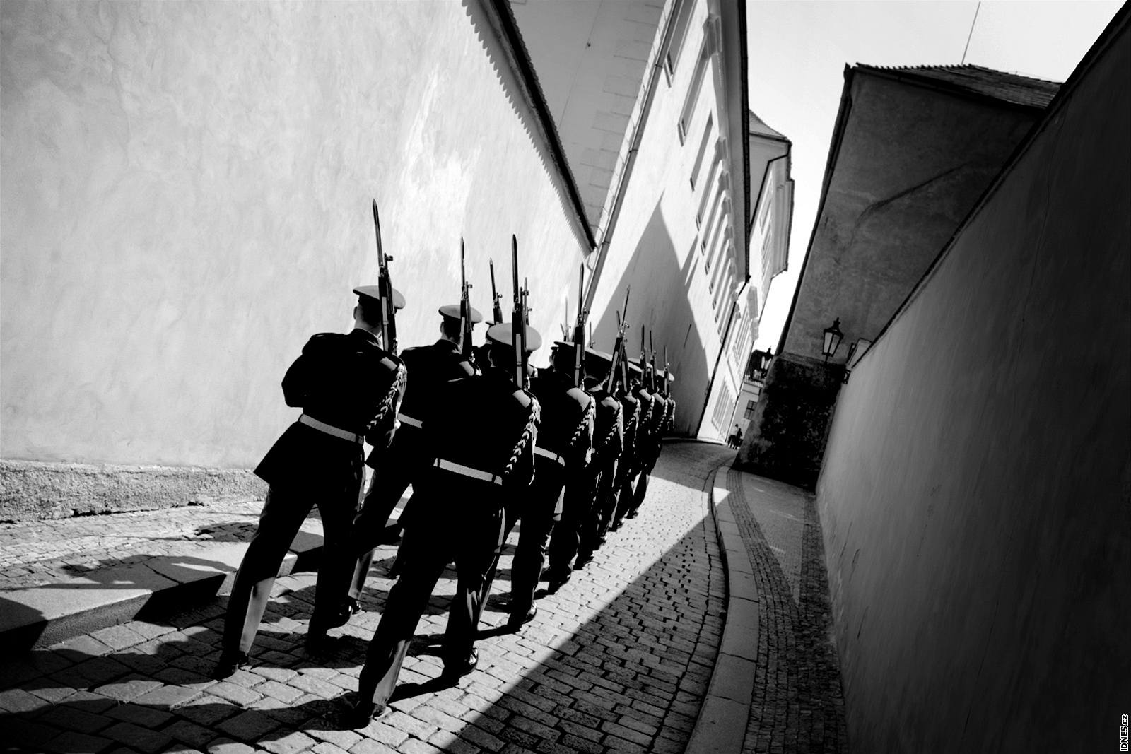 Hradní stráž pochoduje v ulicích nedaleko Pražského hradu. (8. dubna 2010)