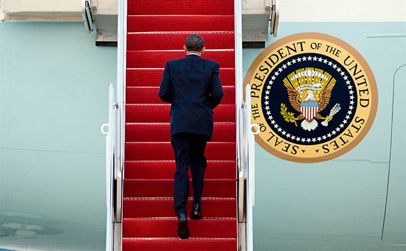 Americký prezident Barack Obama nastupuje do letounu Air Force One před odletem na summit do Prahy (8. dubna 2010)