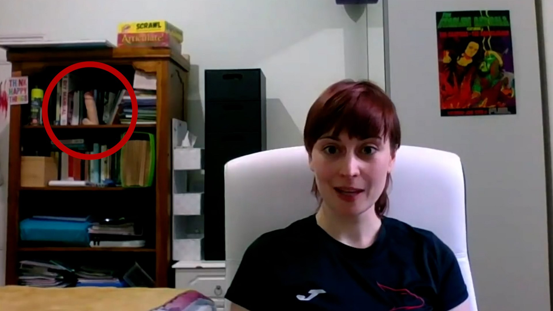Pozornost diváků se však záhy zaměřila na její knihovnu v pozadí. Amosová si tam totiž vystavila objekt, který připomíná mužský pohlavní orgán. Zda se jedná o erotickou pomůcku, nebo jen lechtivou sošku, neobjasnila. Spekuluje se, zda se do žinantní situace uvrhla omylem, či to byl úmysl.