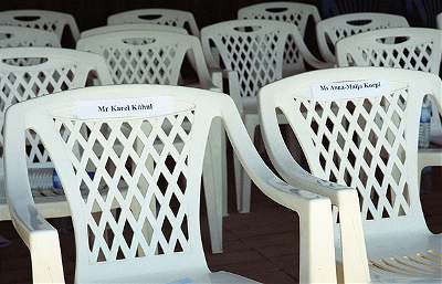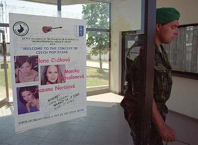 Češi převzali velení v Kosovu - Pro řadové české vojáky, kteří na ceremoniál nemohli a zůstali na domovské základně Šajkovac, ministr přivezl rozptýlení. Už několik dní před touhle parádou na základně visí jednoduché plakáty. Vojákům v Kosovu zazpívá Ilona Csáková, Monika Absolonová a Zuzana Norisová.