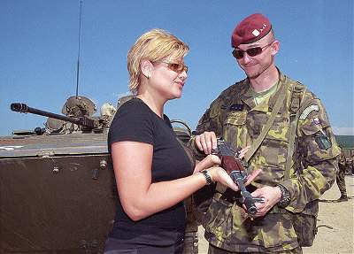 Češi převzali velení v Kosovu - Zpěvačka Zuzana Norisová zkouší výstroj českých vojáků v Kosovu.