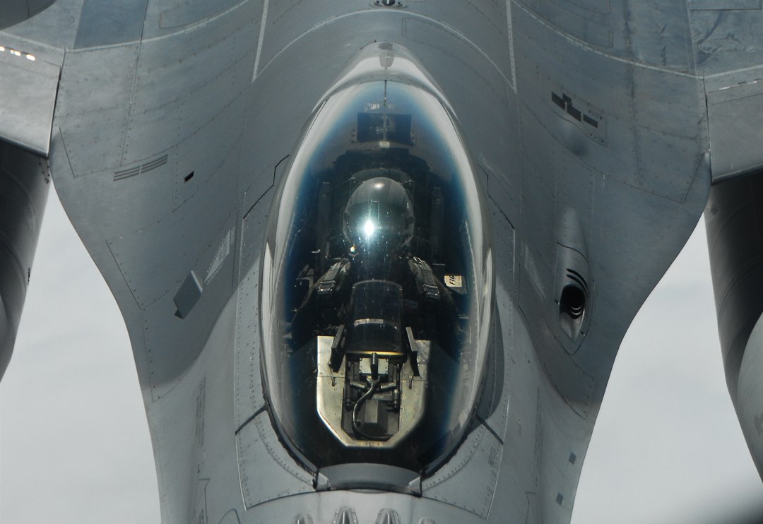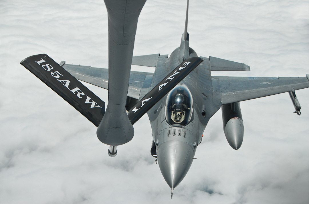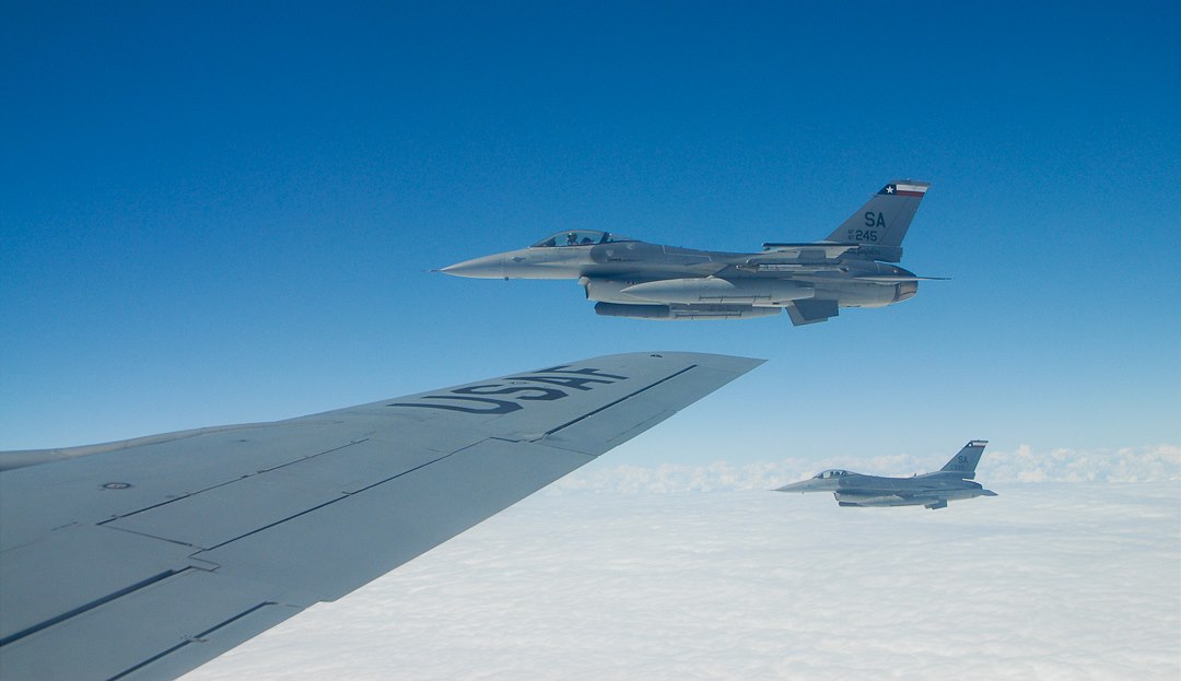 Tankování amerických letounů F-16 texaské Národní gardy za letu během cvičení Sky Avenger