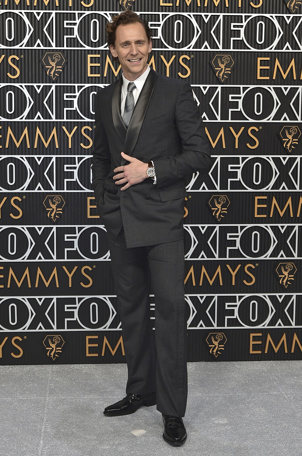 Tom Hiddleston tmavěšedý smoking doplnil kravatou.