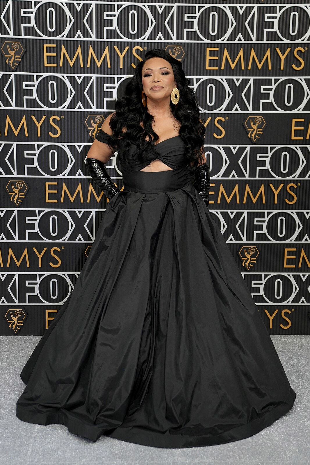 Tisha Campbellová černé šaty doplnila lesklými rukavicemi.