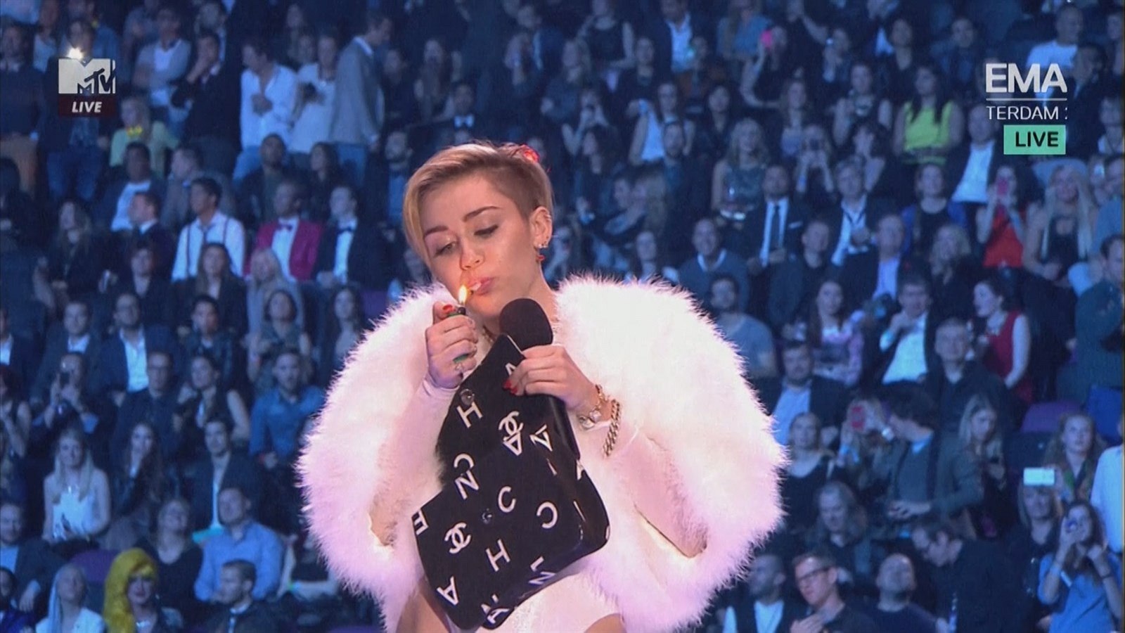 Dech ovšem vyrazila všem až ve chvíli, kdy si přišla v bílém body s kožešinou pro cenu a vyndala z kabelky cosi, co vypadalo jako joint, a v klidu si zapálila. Jestli to byla skutečná marihuana, se neví. Rozhodně to tak mělo vypadat. Cyrusová tím prý chtěla vzdát hold městu za jeho toleranci.