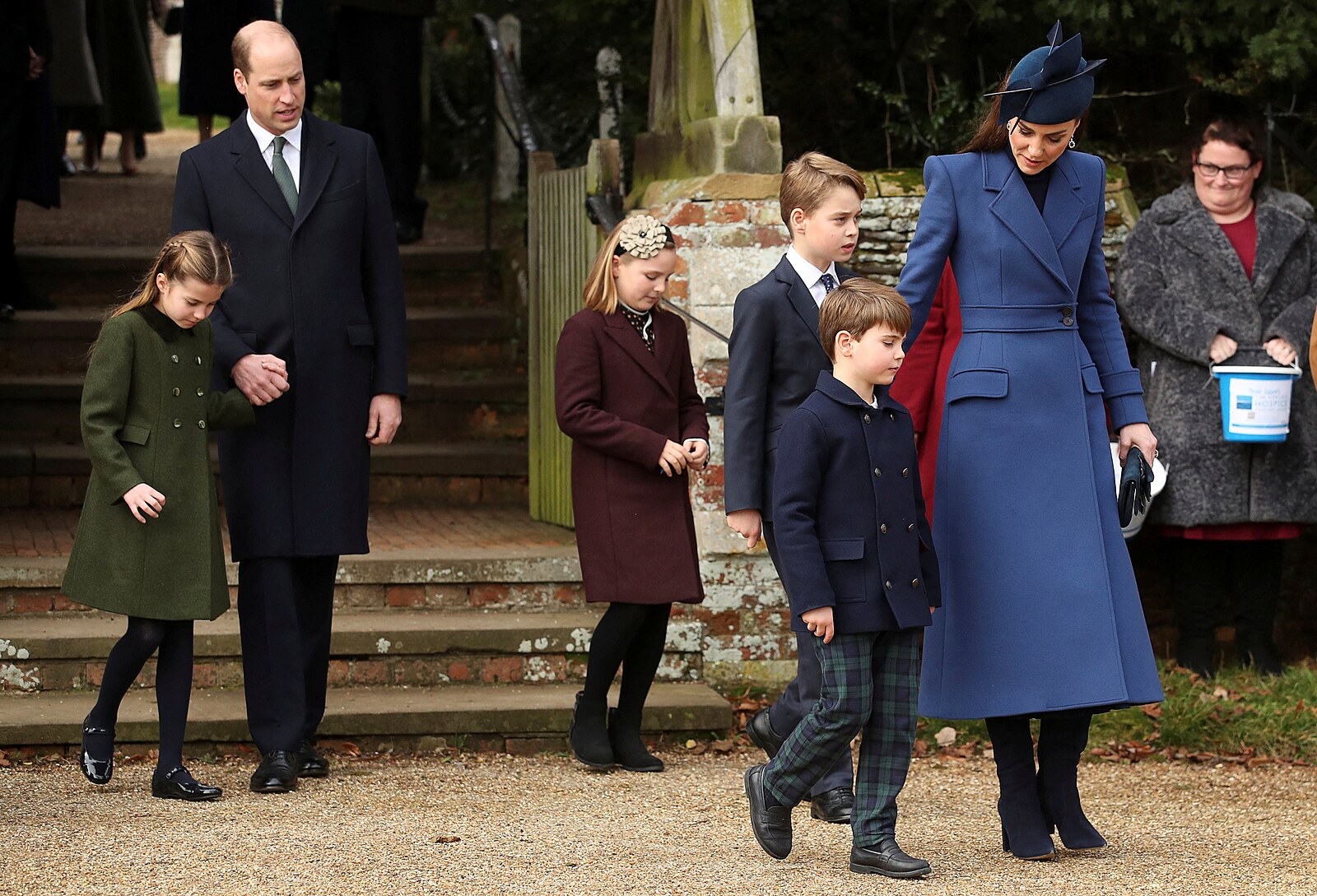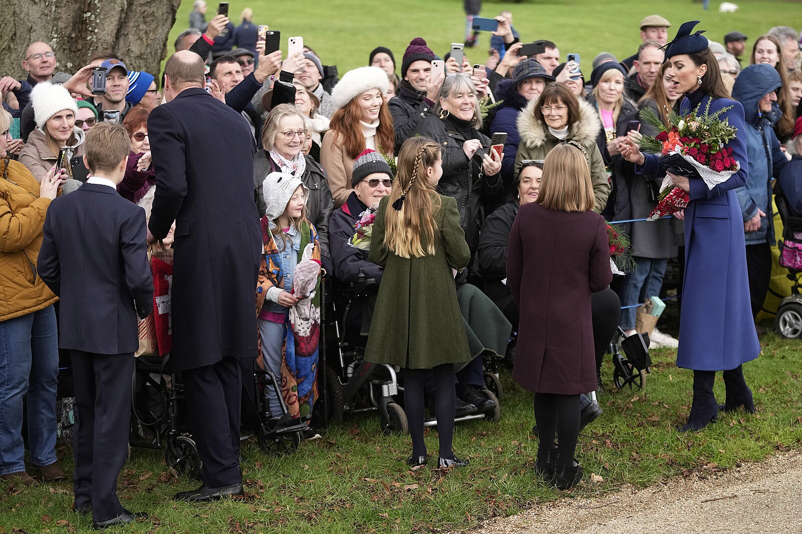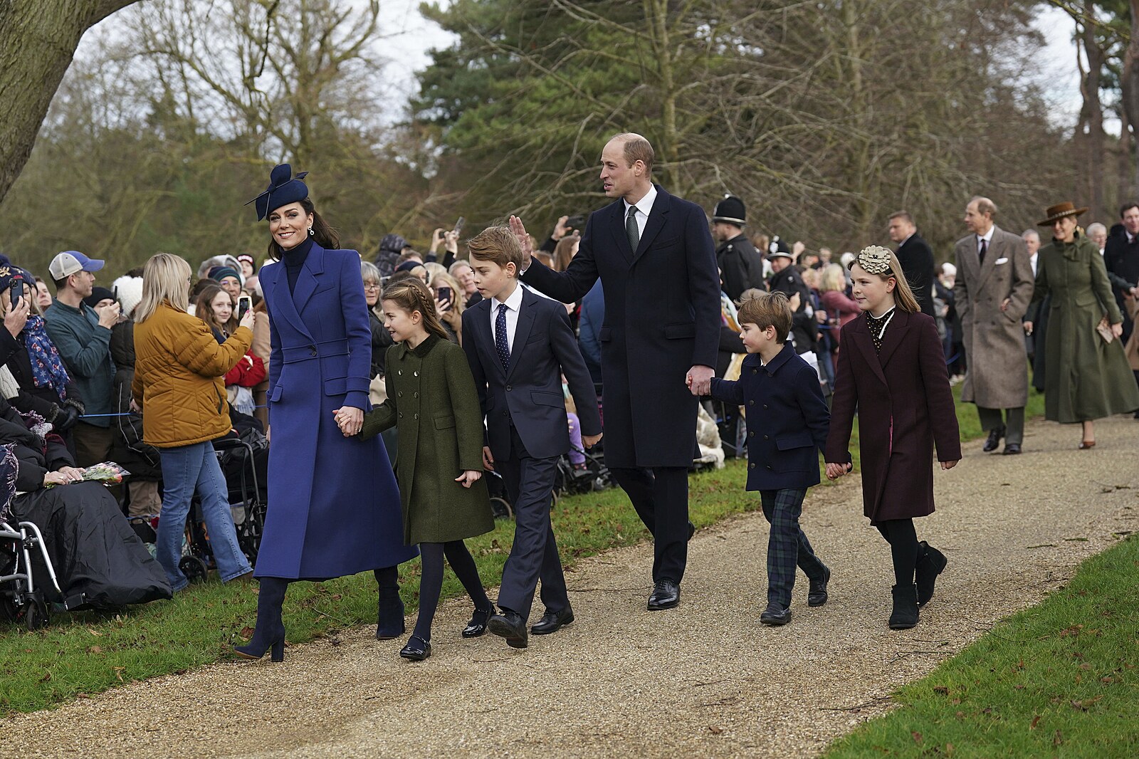 Peincezna Kate a princ Louis se zdraví s přítomnými lidmi. (Sandringham, 25. prosince 2023)