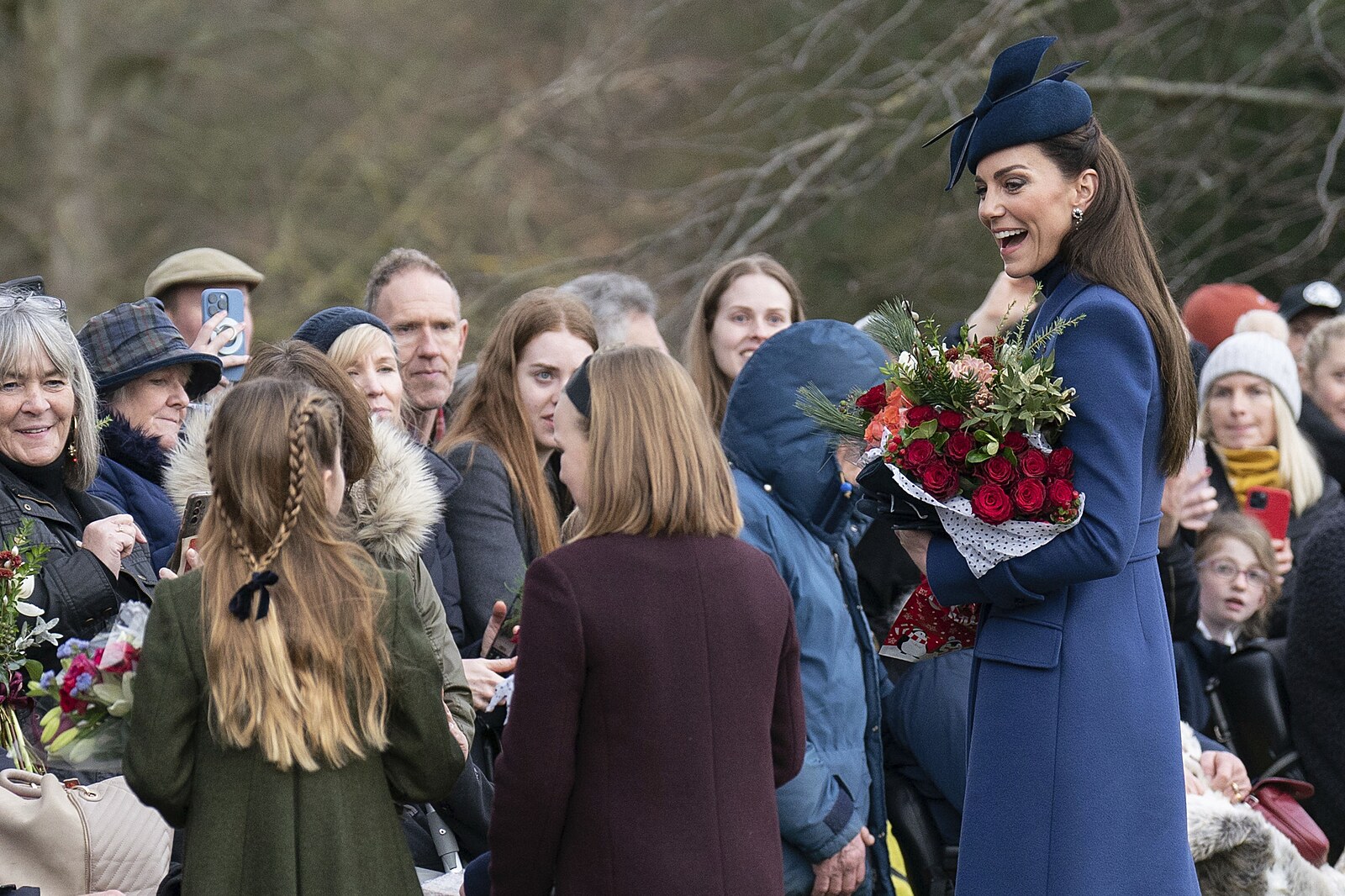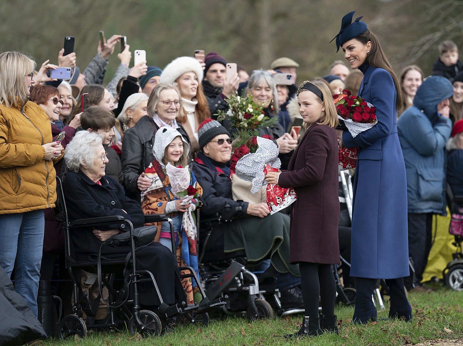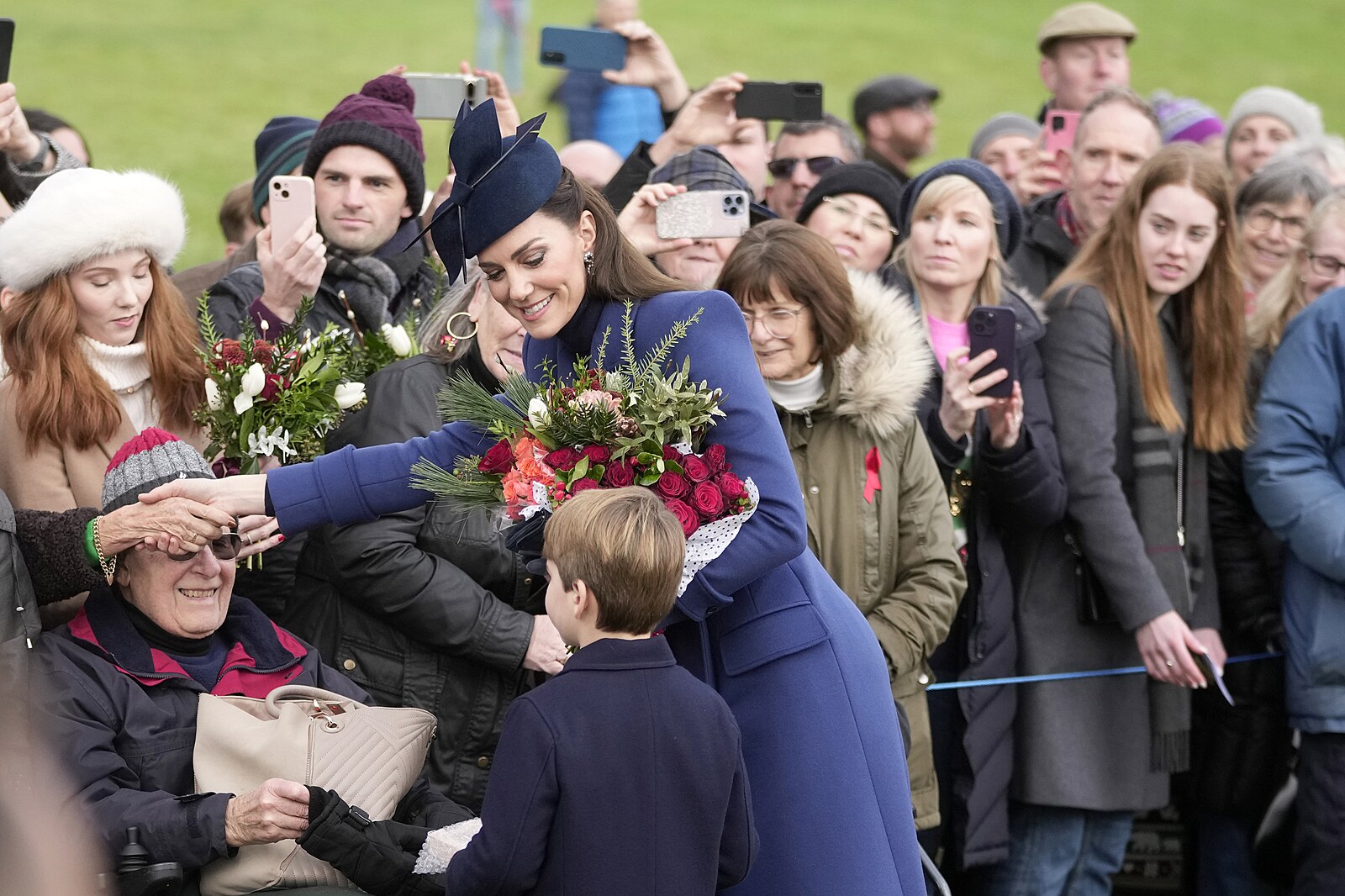 Peincezna Kate a princ Louis se zdraví s přítomnými lidmi. (Sandringham, 25. prosince 2023)