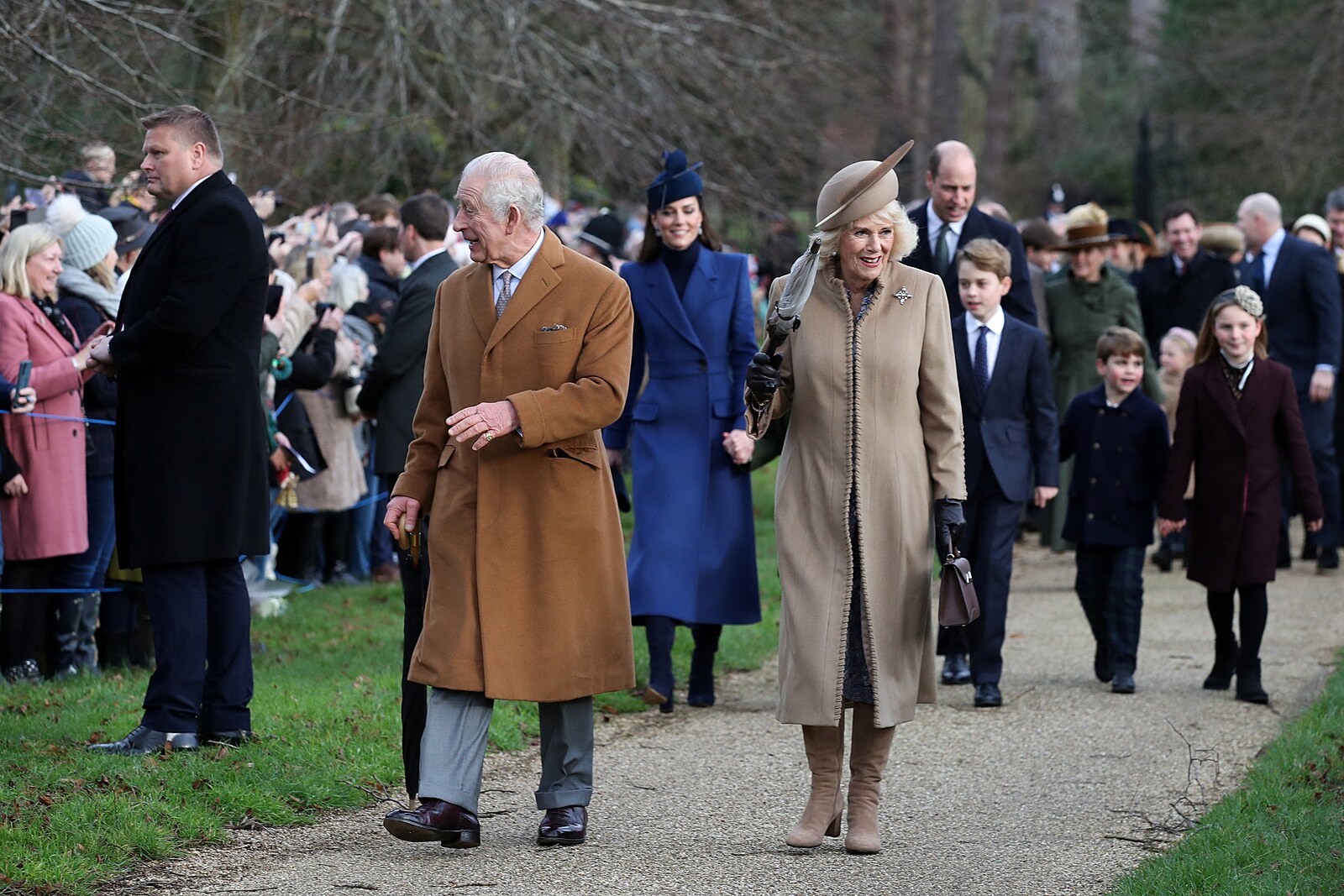 Král Karel III. a královna Camilla po bohoslužbě v Sandringhamu (25. prosince 2023)