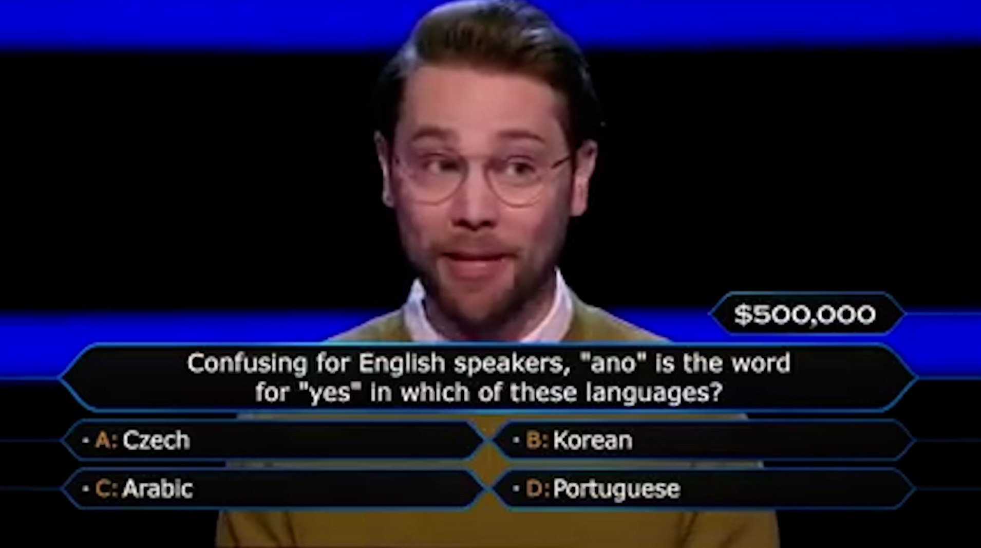 Slovo „ano“ znamená „yes“ v jakém jazyce?“ zněla otázka za v přepočtu 10 milionů, na kterou nedokázal J.D. Barton odpovědět. Na výběr měl z těchto čtyř možností: čeština, arabština, korejština a portugalština. Odpověď však neznal a po chvíli poprosil o radu Jimmyho Kimmela, který nové díly v Americe letos obnovené populární soutěže moderuje.