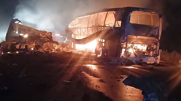 Na záběrech z místa je vidět hořící autobus, který byl zcela zničen.