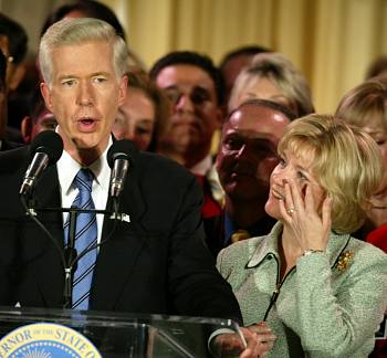 Dosavadní guvernér Kalifornie Gray Davis a uznal v Los Angeles vítězství republikánského kandidáta a herce Arnolda Schwarzeneggera v guvernérských volbách. Vpravo je Davisova manželka Sharon. (8. října 2003) |
