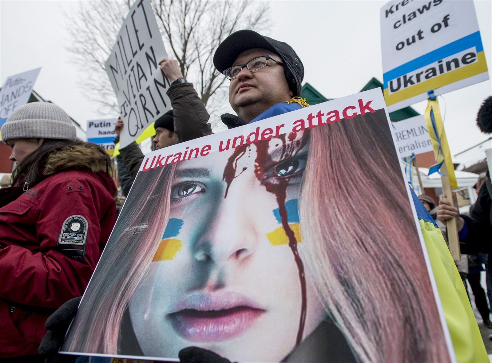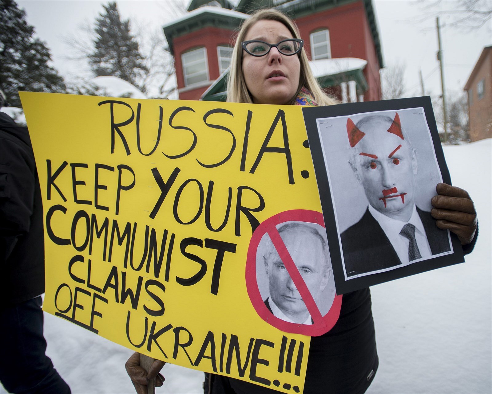 Teťjana Sirská se zúčastnila protestu před ruskou ambasádou v Ottawě. Na transparentu vzkazuje Rusku, aby "nesahalo svými komunistickými pařáty na Ukrajinu" (1. března 2014).
