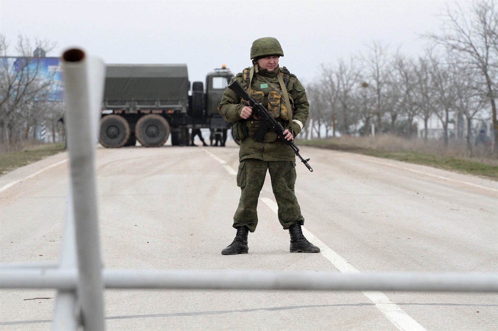 Ozbrojenec střeží cestu k letišti Belbek nedaleko Sevastopolu (1. března 2014).