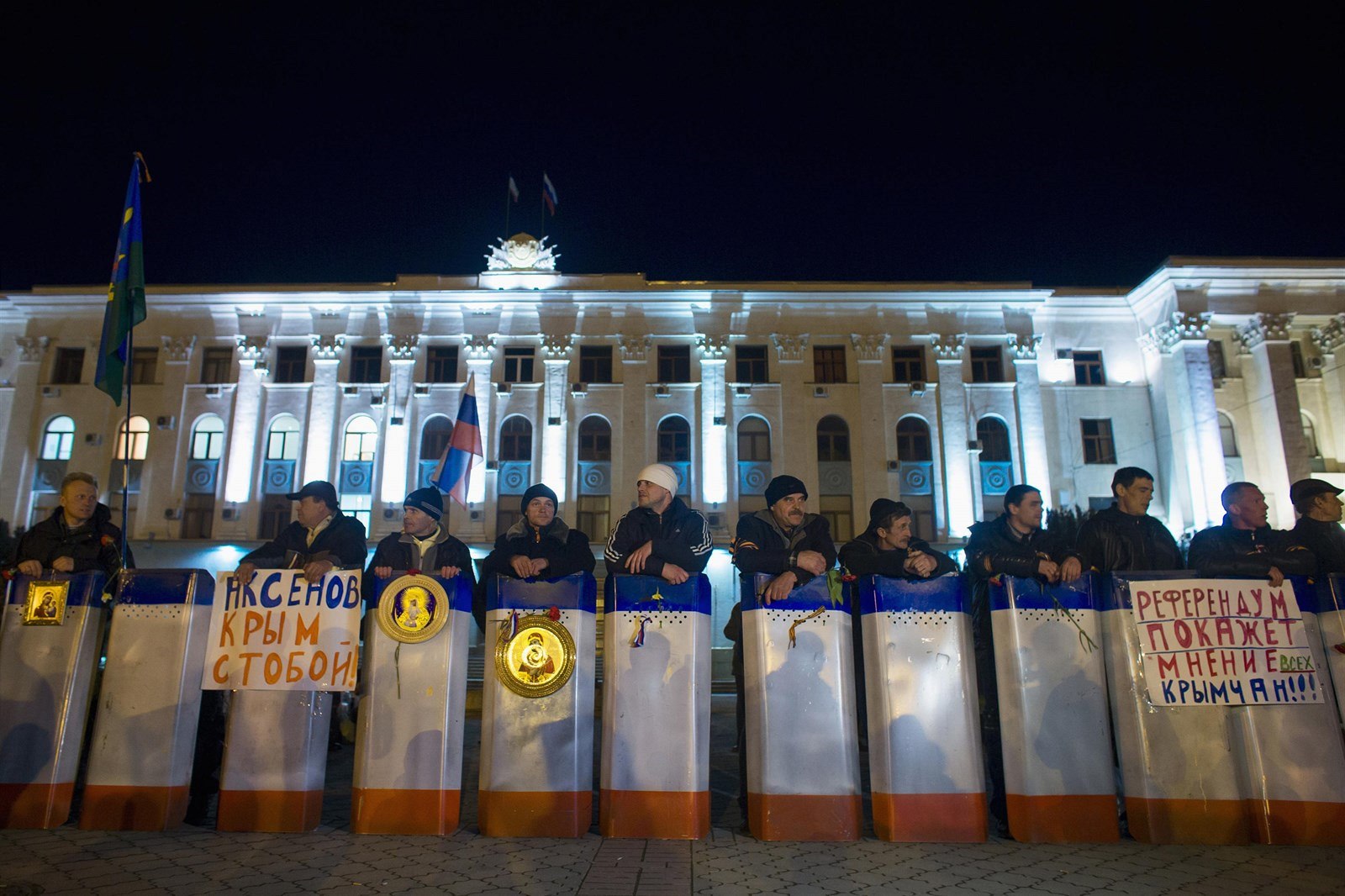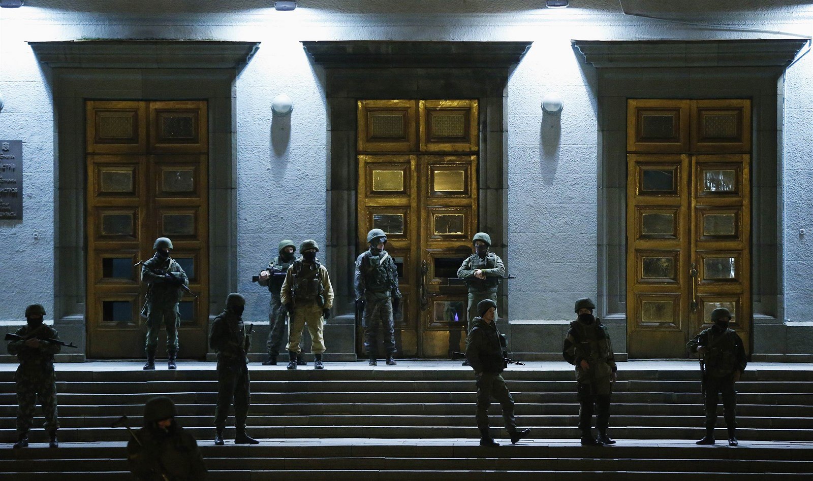Členové krymské domobrany hlídkují před vládní budovou v Simferopolu.