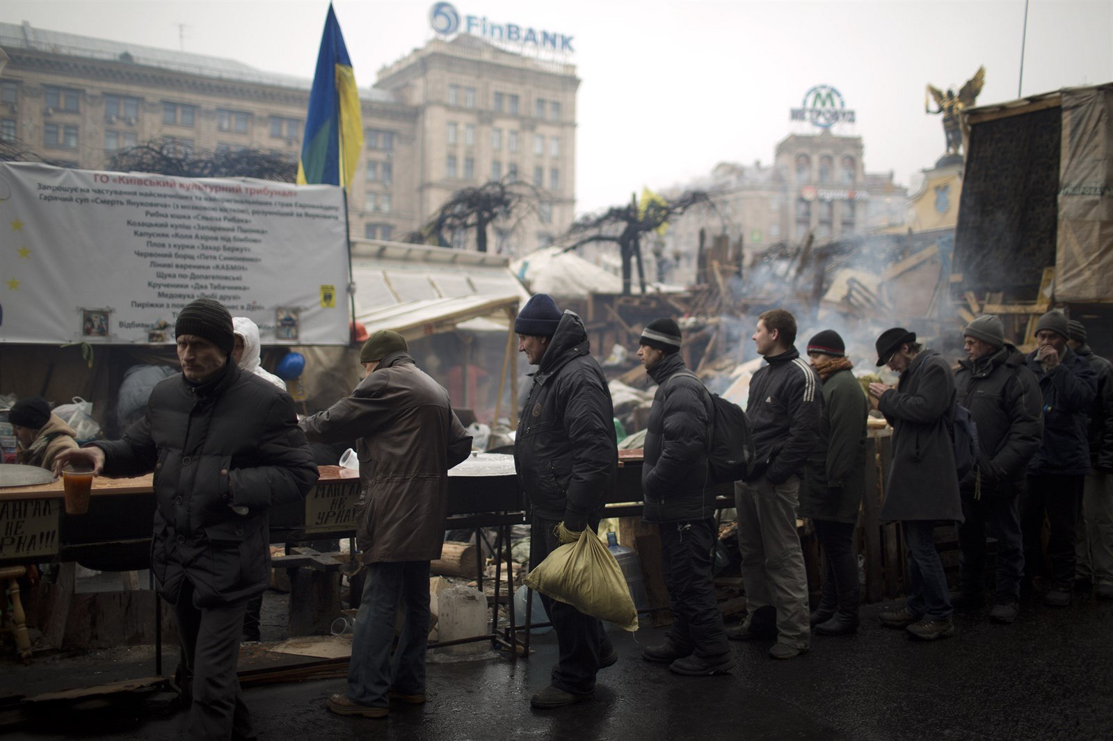 Lidé čekají frotnu na polévku na náměstí Nezávislosti v centru Kyjeva. (2. března 2014)