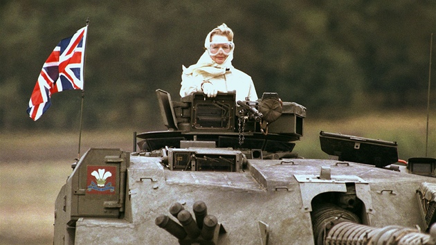 Po prohlídce areálu Thatcherová přichází k mohutnému tanku Challenger. Vojáci jí pomáhají vyšplhat na věž a ona s úsměvem usedá do obrněného vozidla. Šátek jí neomaleně vlaje ve větru, pohled jednašedesátileté političky je upřený vpřed.