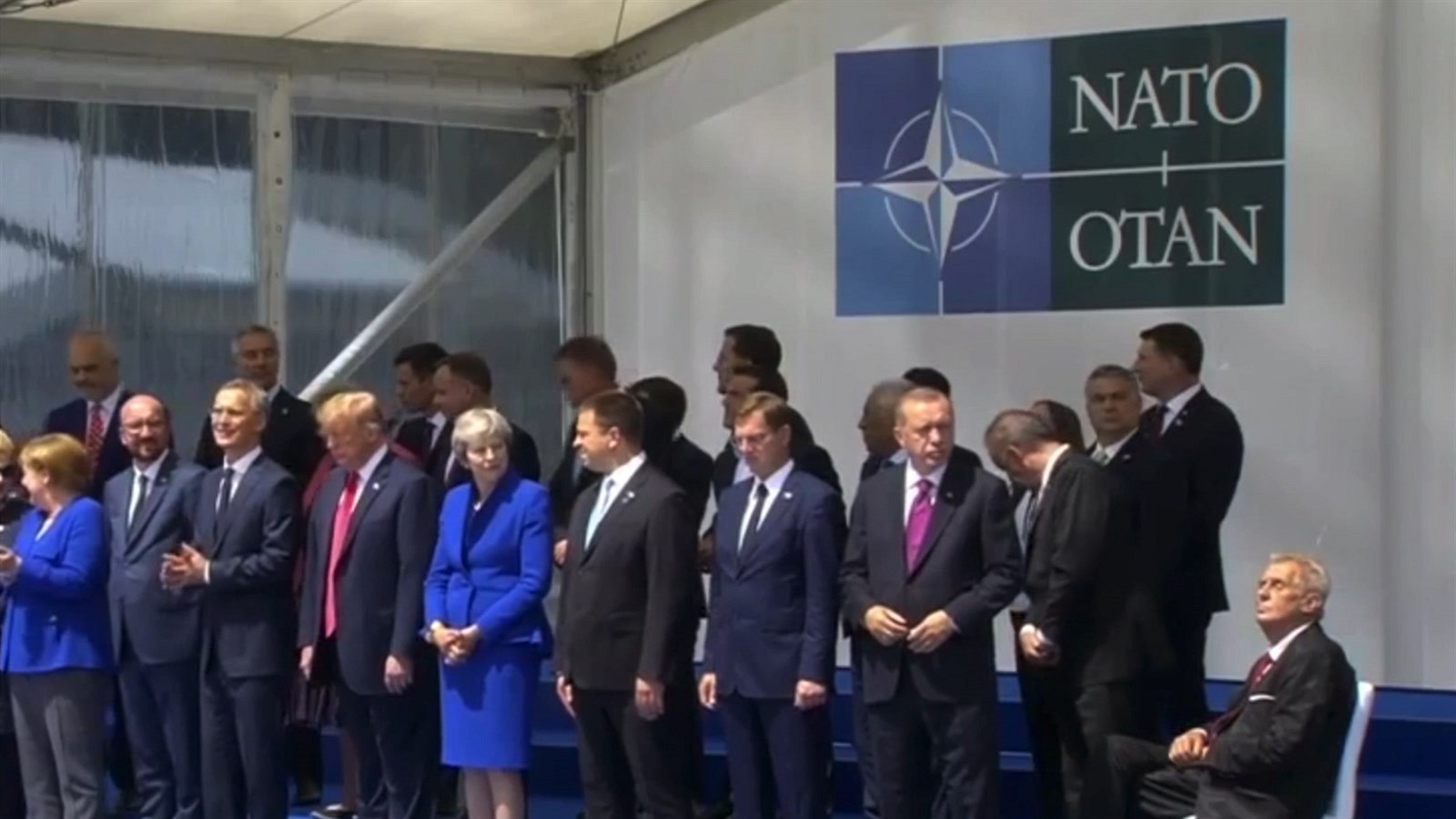 Na snímku Zeman stojí vedle slovenského prezidenta Andreje Kisky a tureckého prezidenta Recepa Tayyipa Erdogana na okraji celé skupiny: