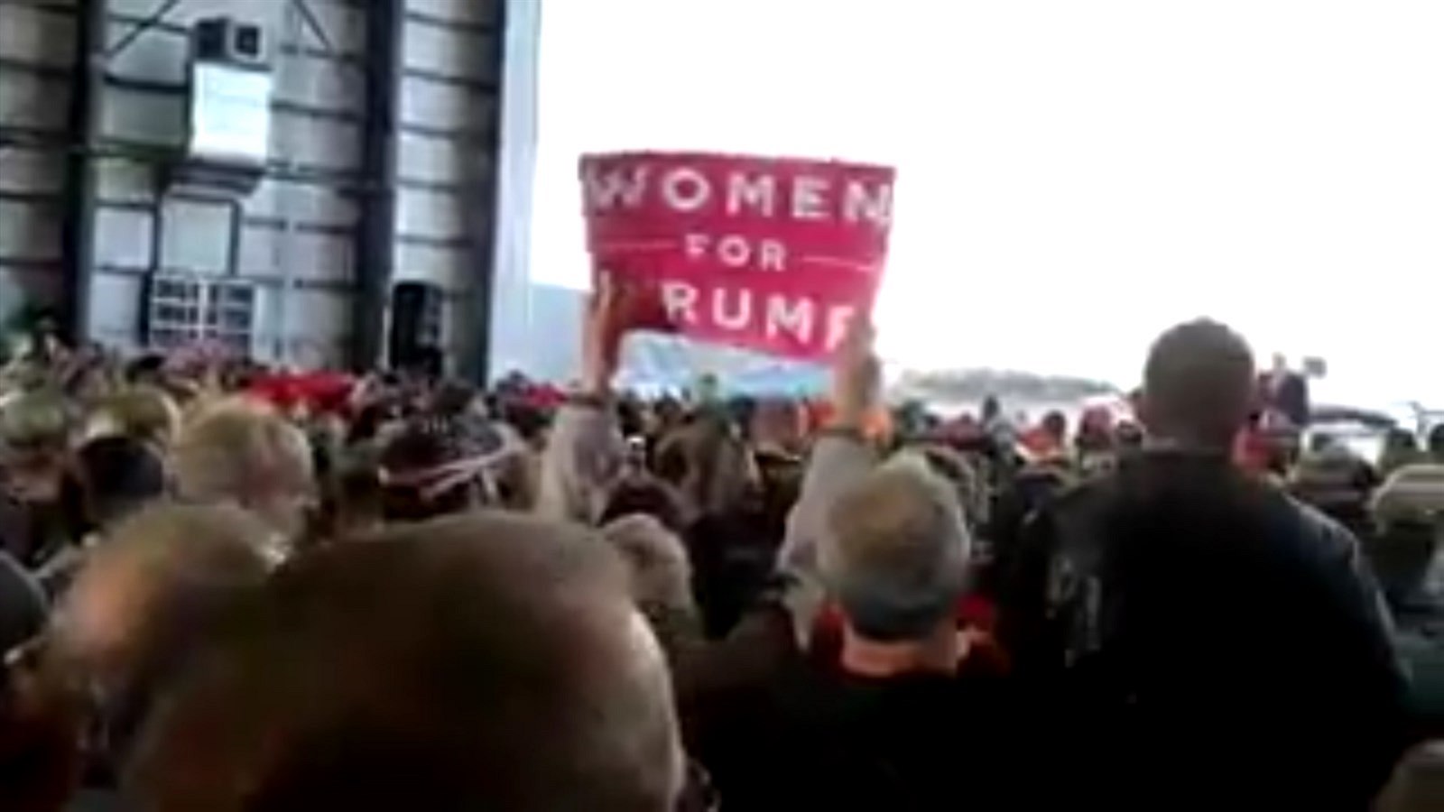 Hodinu před plánovaným projevem začínají lidé v hale pomalu sledovat hodinky. Do davu se vmísí postarší pár. Šedovlasý muž má podpaží vlasteneckou bibli a v ruce štos plakátů se slogany kampaně, které ostatním rozdává. Brzy se tak nad hlavami shromážděných třepetají různobarevné plakáty s nápisy „Women for Trump“ „Hispanics for Trump“.