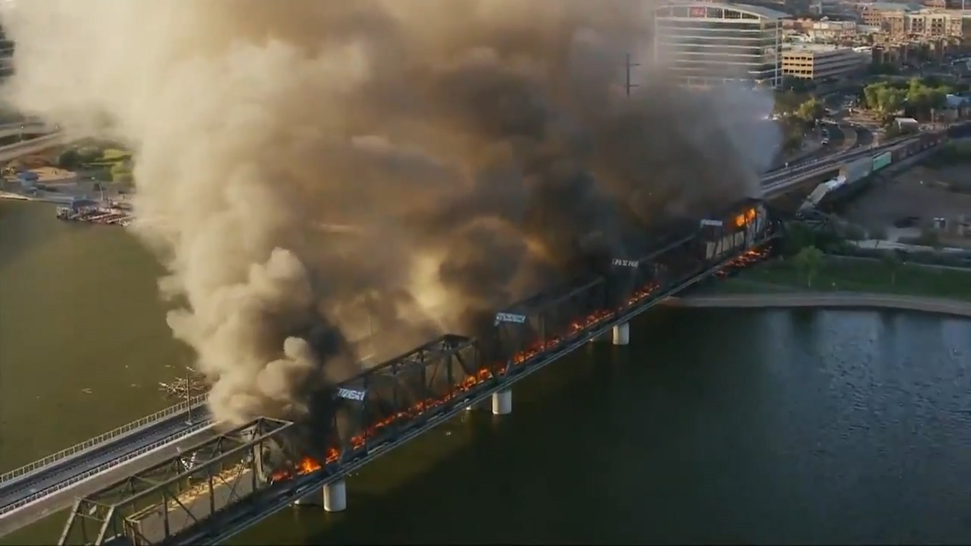 Podle záchranářů hoří několik vagónů nákladního vlaku, řada z nich převážela dříví. Nemají informace, že by někdo utrpěl zranění. Část konstrukce mostu se zřítila, ne však nad řekou, ale přilehlým parkem.