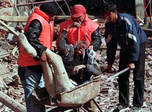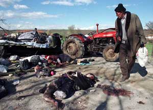 ![]() Záchranáři pomáhají ženě zraněné při zásahu konvoje uprchlíků v Kosovu |