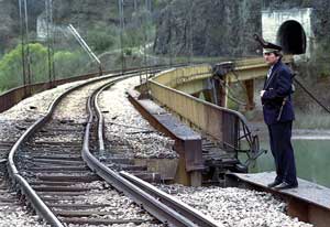 ![]() Železničář u zničeného mostu přes řeku Lim u vesnice Bistrica, které leží asi 280 km od Bělehradu |