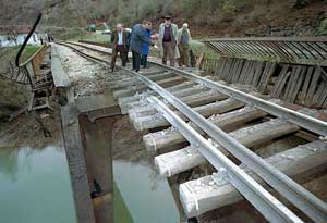 ![]() Lidé prohlížejí zničenou železniční trať u vesnice Bistrica |