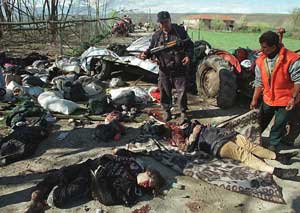 ![]() Policista prohlíží mrtvé u kosovské vesnice Meja, kde zahynully desítky lidí při útoku na konvoj uprchlíků |