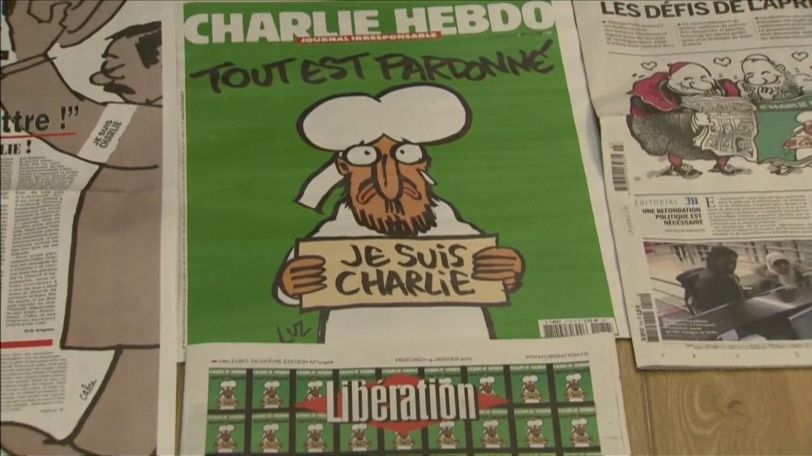 Nové číslo má na titulní straně karikaturu plačícího proroka Mohameda držícího nápis Je suis Charlie (Já jsem Charlie) (více čtěte zde). Tato krátká věta se za poslední týden stala symbolem solidarity s oběťmi teroristů. Nad kresbou bíle oblečeného Proroka stojí nápis: Tout est pardonné (Vše odpuštěno).