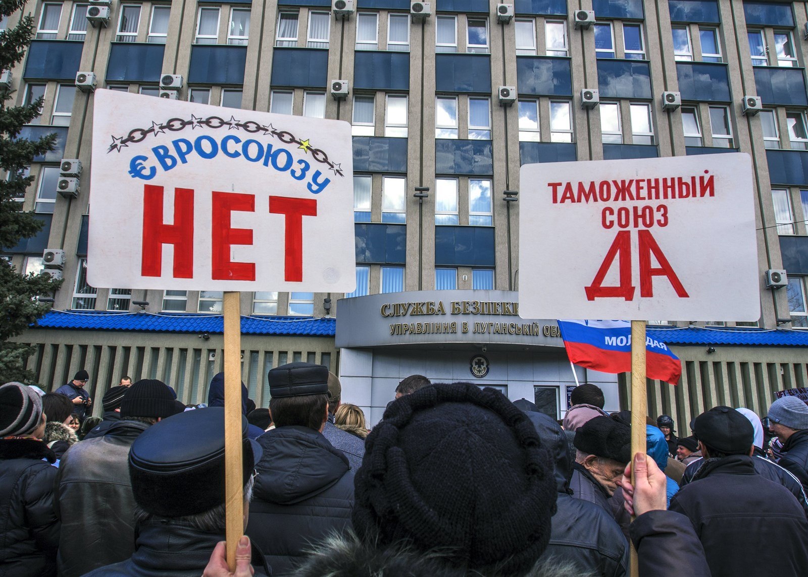 Evropské unii ne, celní unii ano. Proruská demonstrace před budovou ukrajinské rozvědky SBU v Luhansku (7. dubna 2014)