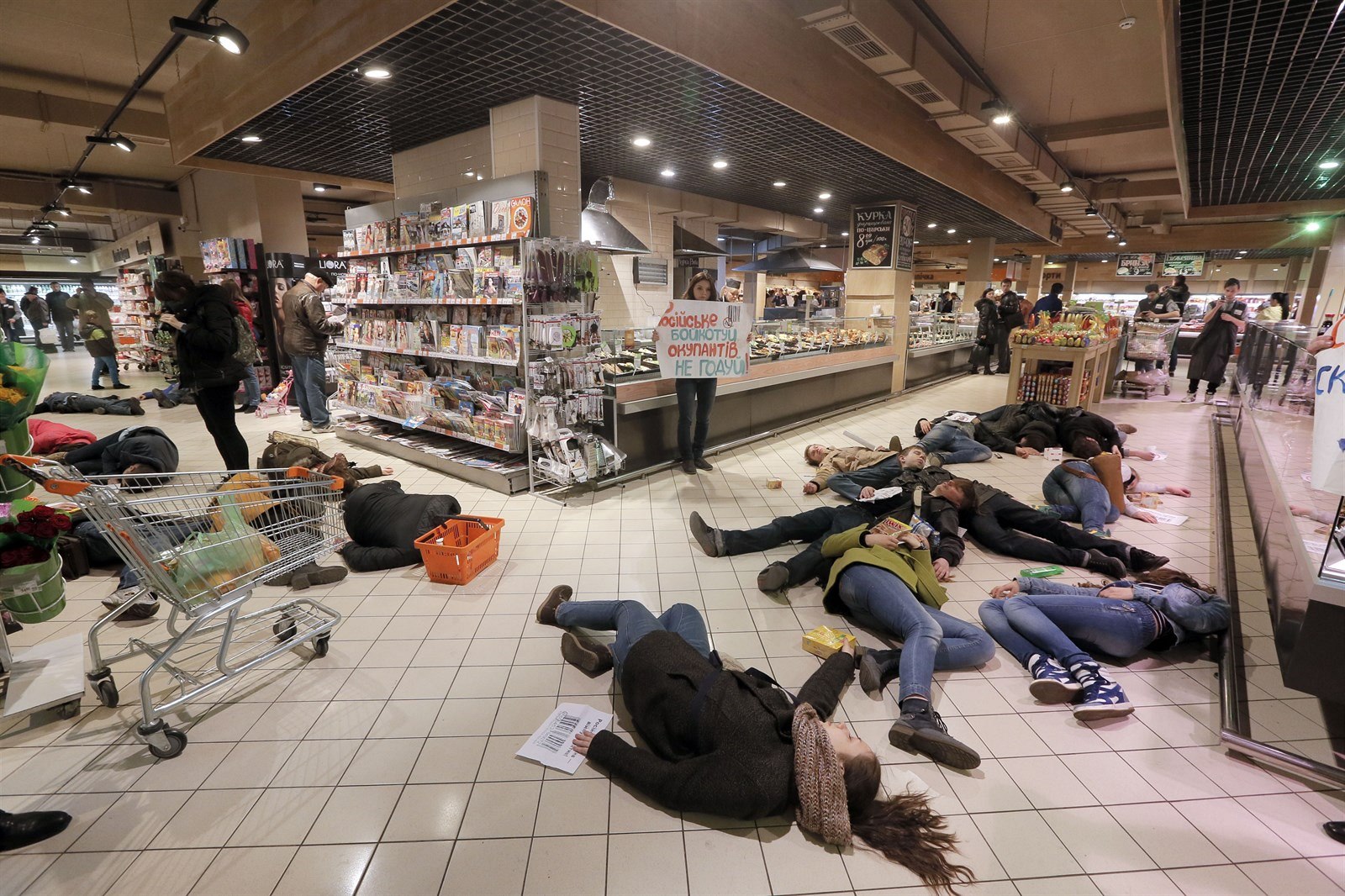 Ruské jídlo je jed. Happening za bojkot ruského zboží v kyjevském supermarketu (7. dubna 2014)