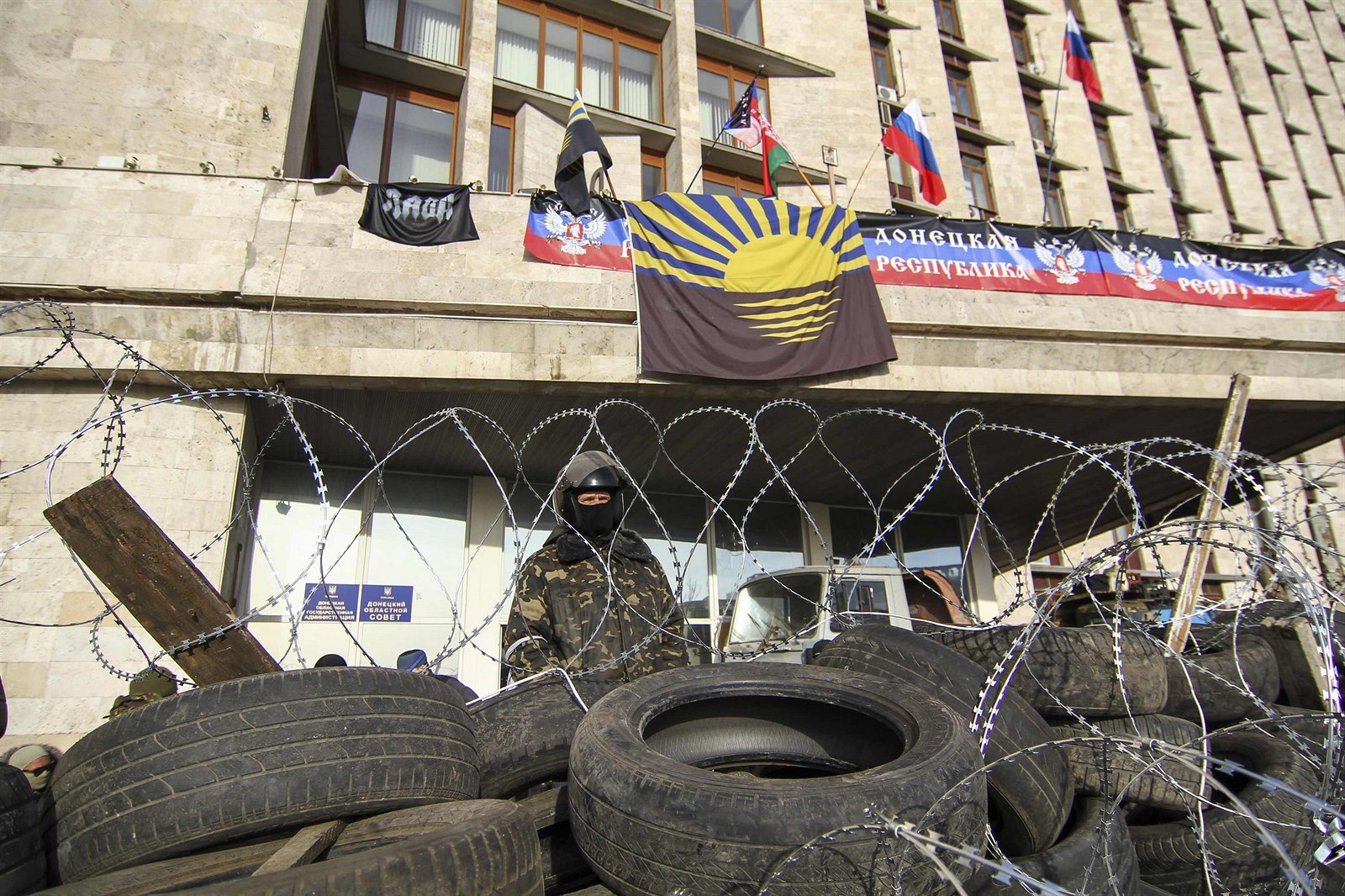 Podle agentury Unian odpoledne nad doněckou oblastní správou zavlály ruské vlajky a prapor takzvané Doněcké republiky (6. dubna)