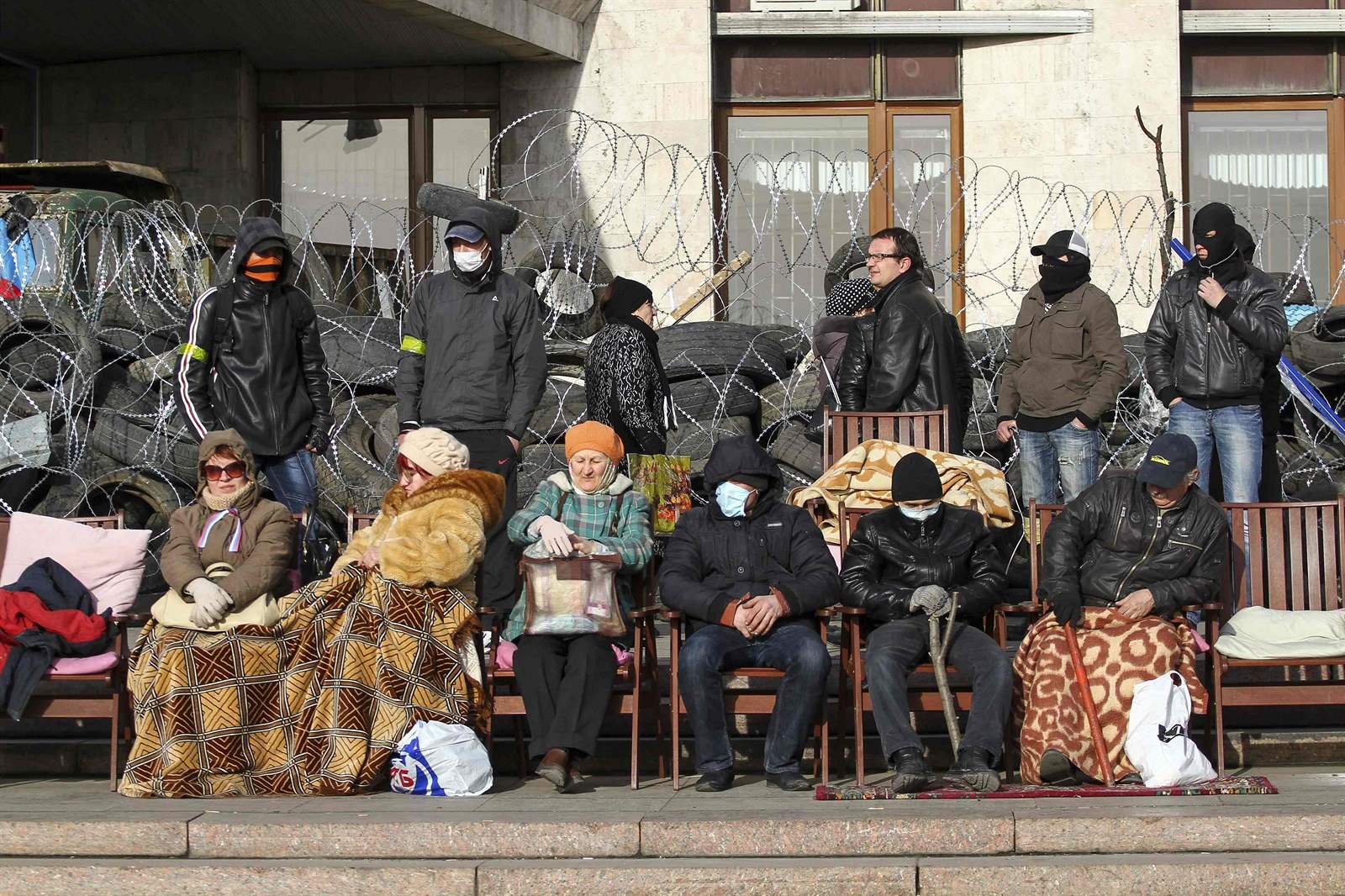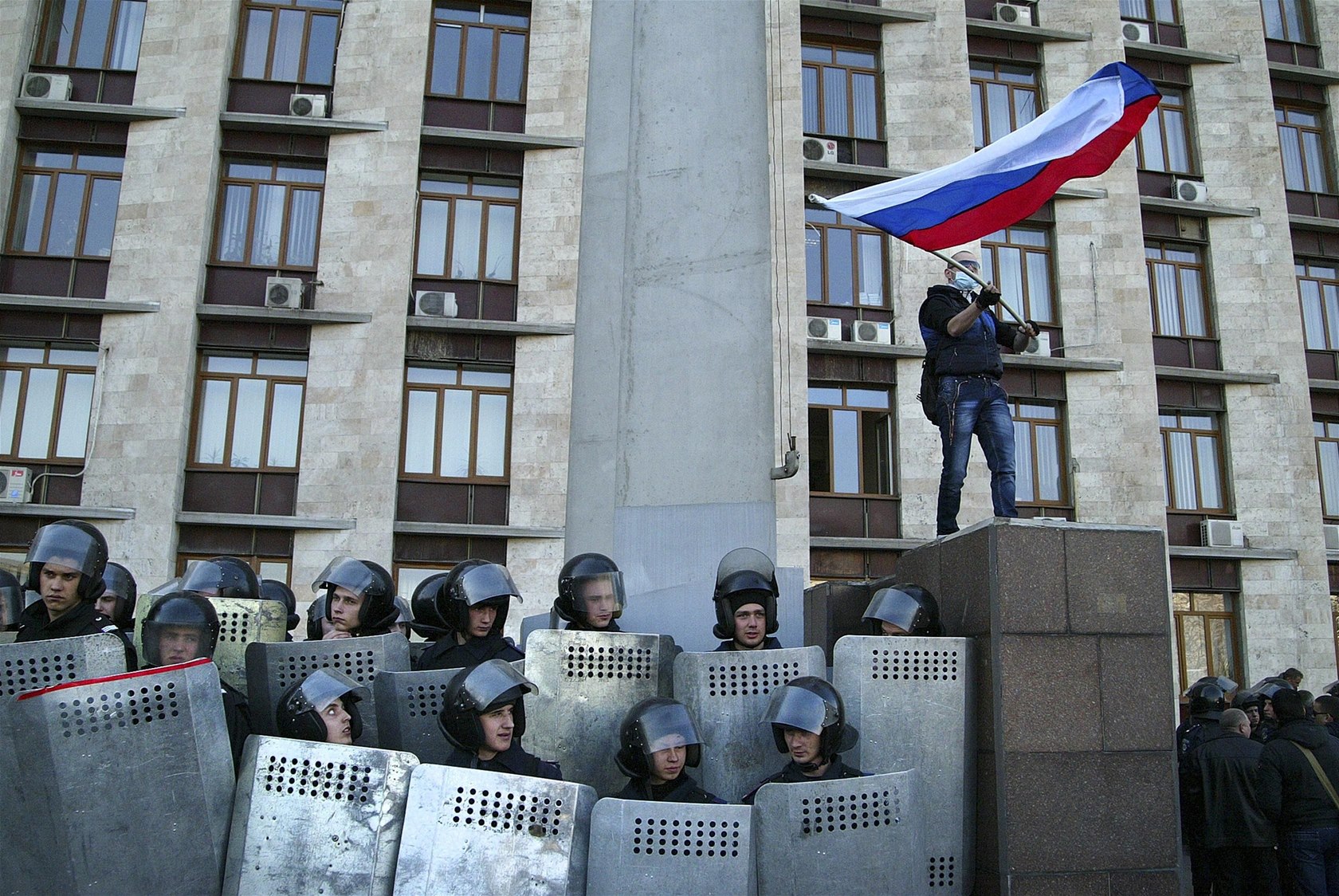 Stoupenci Ruska před obsazenou budovou gubernátora v Doněcku (6. dubna 2014)