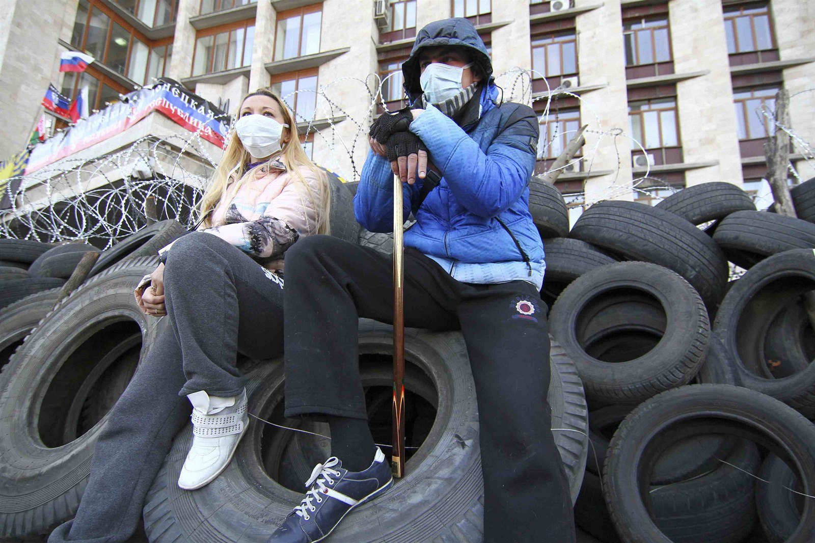 Barikáda proruských demonstrantů před sídlem regionální vlády v Doněcku (7. dubna 2014).