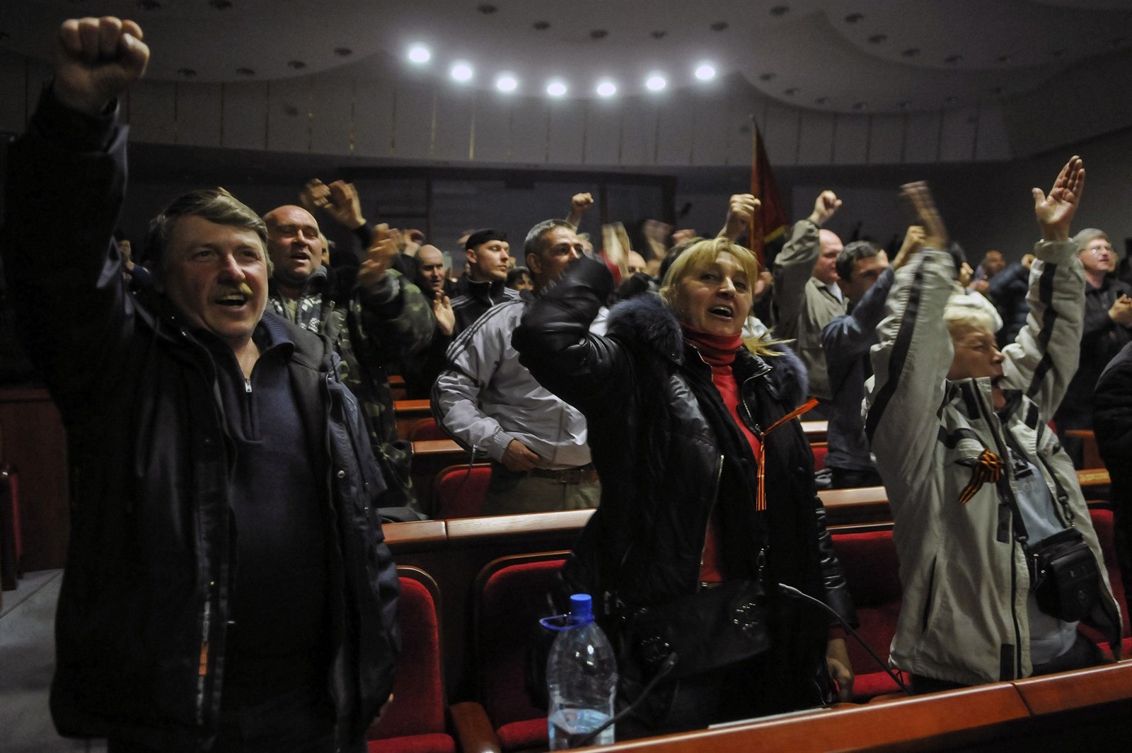 Proruští aktivisté jásají během svého hlasování o vyhlášení nezávislosti (Doněck, 7. dubna 2014)