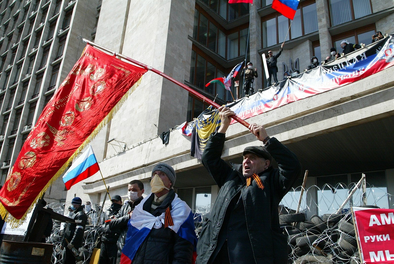 Aktivisté mávali před sídlem doněcké regionální vlády kromě ruských vlajek i sovětskými (Doněck, 7. dubna 2014)