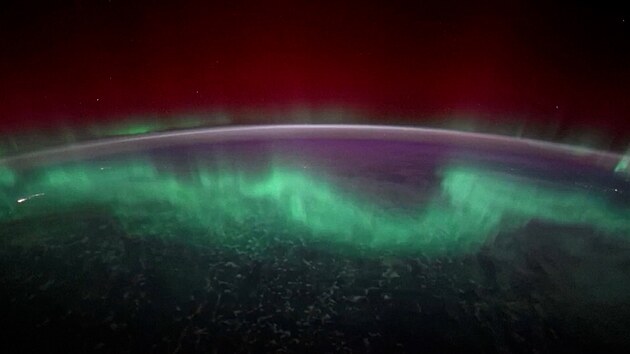 Video ukazuje záři třpytící se na obzoru pod oponou zeleného, červeného a fialového světla nad planetou Zemí.