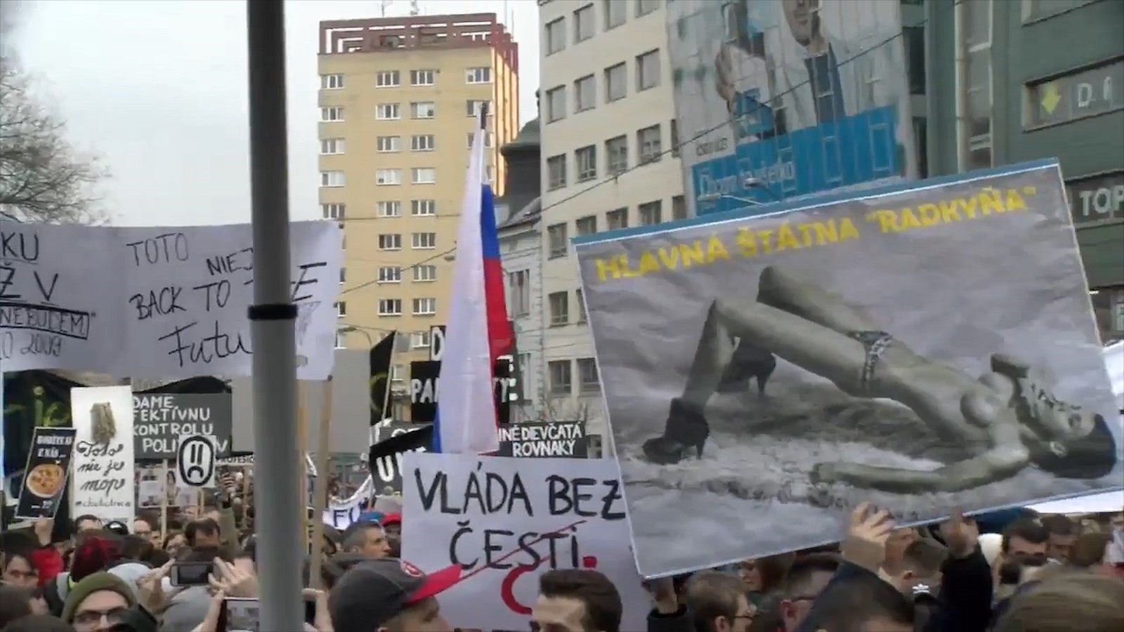 „Vláda sice podala demise, ale v pozadí zůstávají stejní lidé,“ řekli z bratislavského podia občanští aktivisté Karolína Farská a Juraj Šeliga. Dodali, že lídři koaličních stran se za každou cenu snaží udržet u moci, což označili za důkaz toho, že se snaží zamést pod koberec všechny korupční kauzy, o kterých psal i zastřelený novinář Kuciak.