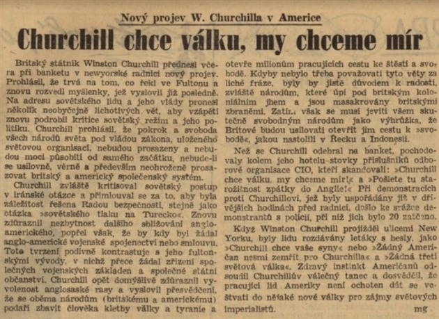 V duchu této linie reagovalo i československé Rudé právo. „Churchill opět domýšlivě zdůraznil vyvolenost anglosaské rasy a vyslovil přesvědčení, že se oběma národům (britskému a americkému) podaří zbavit člověka kletby války a tyranie. Kdyby nebylo třeba považovati tyto věty za liché fráze, byly by jistě důvodem k radosti, zvláště národům, které úpí pod britským koloniálním jhem a jsou masakrovány britskými zbraněmi,“ stálo v článku Churchill chce válku, my chceme mír.