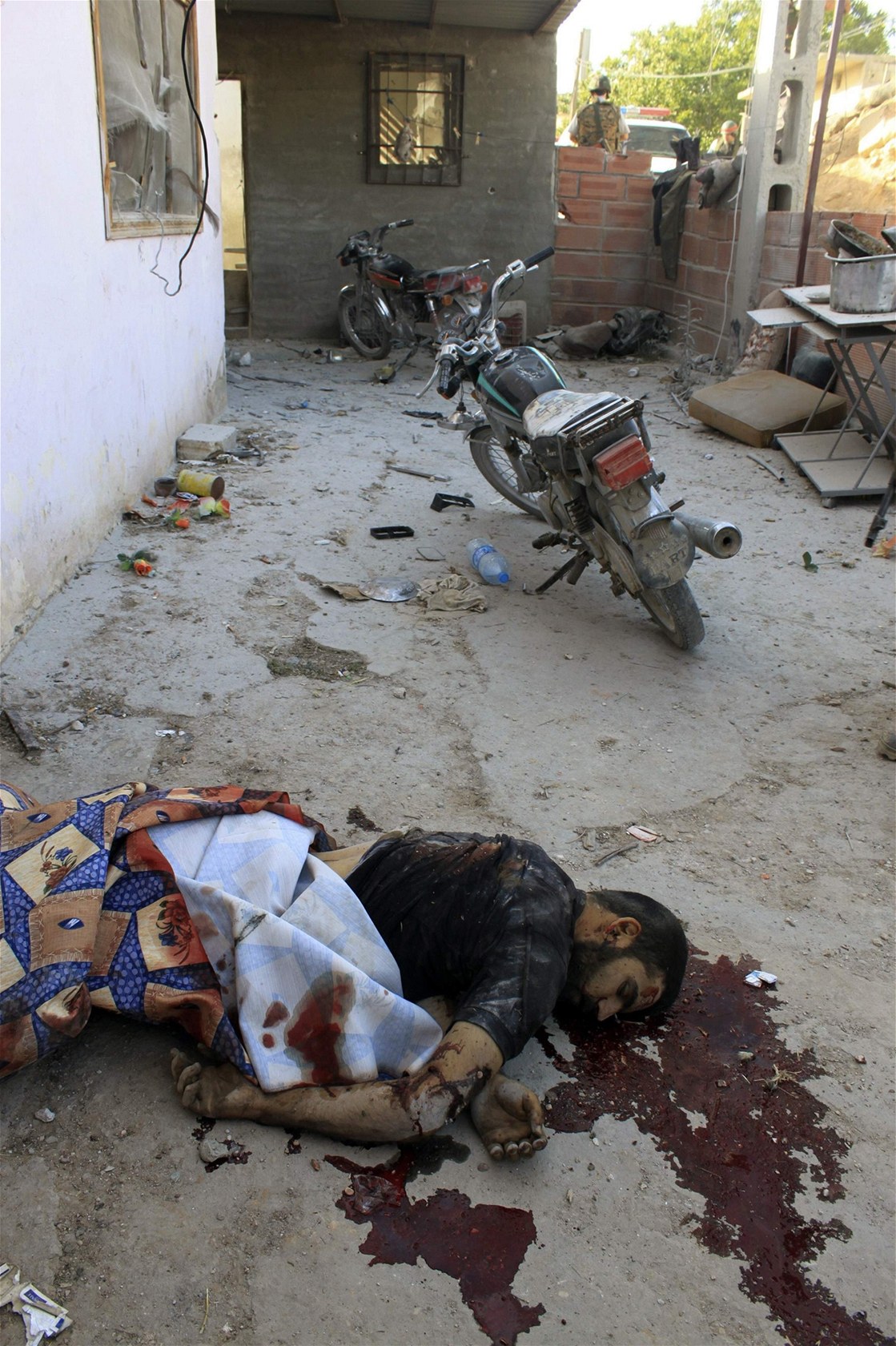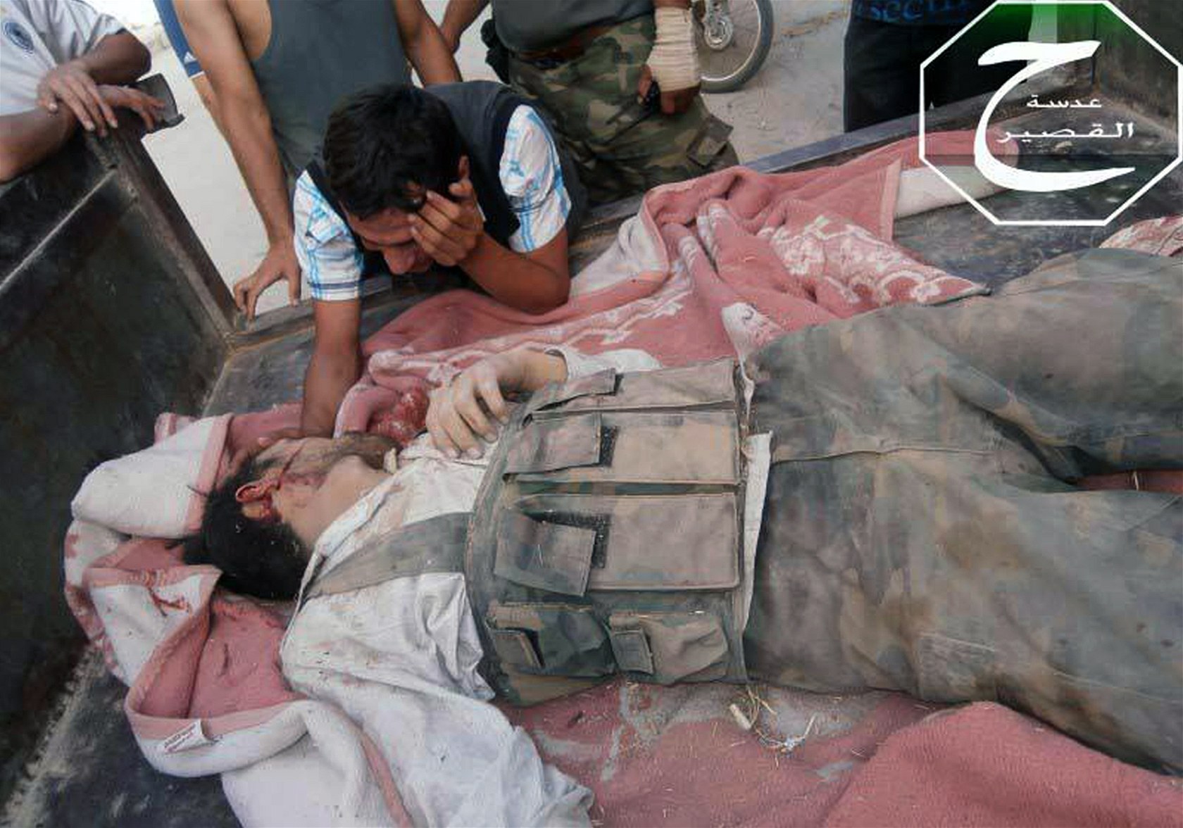 Tělo povstalce, který padl v bojích o město Kusajr (2. června 2013)