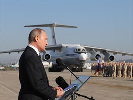 Ruský prezident Vladimir Putin promlouvá k nastoupené jednotce na letecké základně Hmímím v Sýrii (12. prosince 2017)