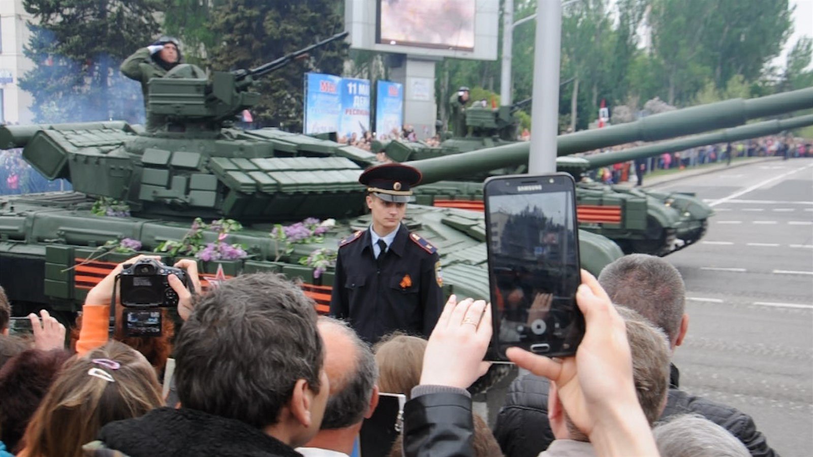 Když z reproduktorů zahřměla píseň Svatá válka, daly se zástupy vojáků do pohybu. V čele vojenské techniky jel legendární sovětský tank T-34 vyzdobený nápisem „Za vítězství“. Následovaly kaťuše, nákladní automobily ZIS-5, tanky T-64 a T-72, protiletadlové kanóny a děla. Velitel přehlídky postupně jmenoval salutující důstojníky a uváděl, kde se vyznamenali v boji s ukrajinskou armádou.