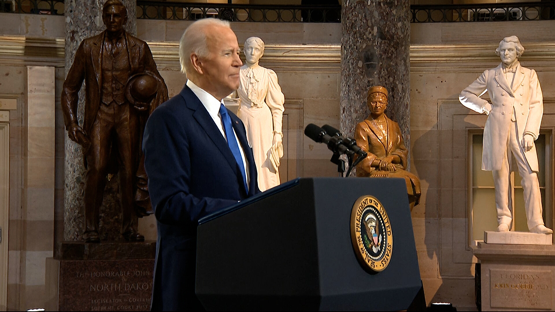 „Ale nepovedlo se jim to. Musíme zajistit, že se takový útok už nikdy nestane,“ pokračoval. Biden také ocenil nasazení policistů, kteří se snažili ochránit demokratickou instituci navzdory obrovské přesile. „Naše demokracie vytrvala. Náš národ vydržel a my zvítězili,“ řekl v témže sále, který před rokem zaplavili demonstranti.