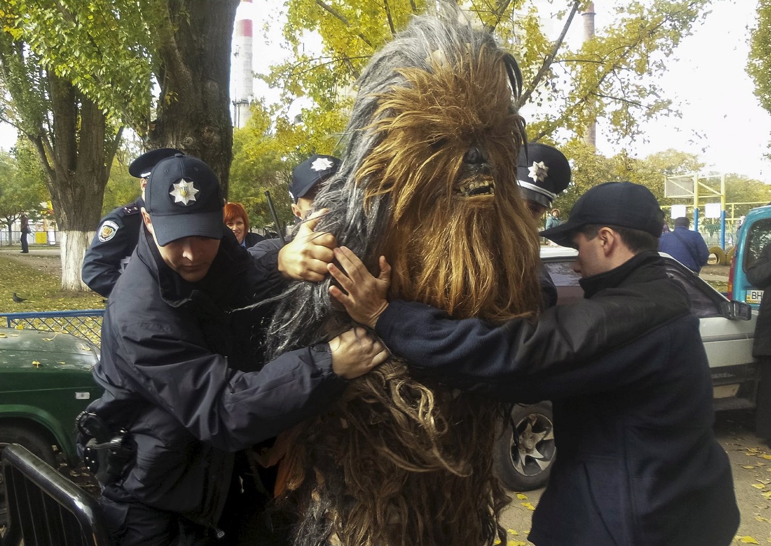 Pokoušel se totiž přímo k volebním urnám v koloně aut dovézt svého lídra. Policie však zastavila jejich vůz a dožadovala se po muži v masce legitimace. Ten doklad odmítl předložit. Policie tak po krátké potyčce Chewbaccu zadržela. Na kapotu policejního vozu ho museli přitlačit čtyři policisté. Slavný chlupáč později stanul před soudem, který mu vysvětlil, že během volebního dne je zakázáno propagovat kandidáty jednotlivých stran. Kolona automobilů také podle policie blokovala ulici.