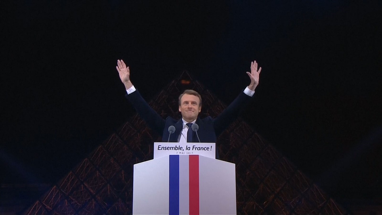 Krátce po půl jedenácté večer předstoupil Macron za zvuků Ódy na radost, hymny Evropské unie, před své příznivce čekající na prostranství před Louvrem. Na úvod jim poděkoval a ujistil je, že bude usilovat o to, aby nezklamal jejich důvěru a bude hájit republiku.